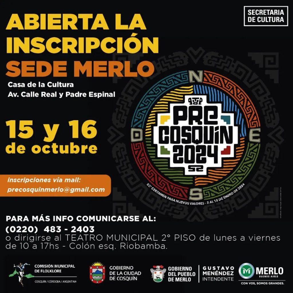 De esta forma, Merlo es nuevamente una de las sedes en donde se eligen a los representantes locales para el Pre Cosquín 2024. Los artistas interesados en inscribirse deberán acercarse al Teatro Municipal de Merlo – Colón esq. Riobamba, 2do piso, de lunes a viernes hábiles de 10 a 17 hs. O enviar un correo a: precosquinmerlo@gmail.com